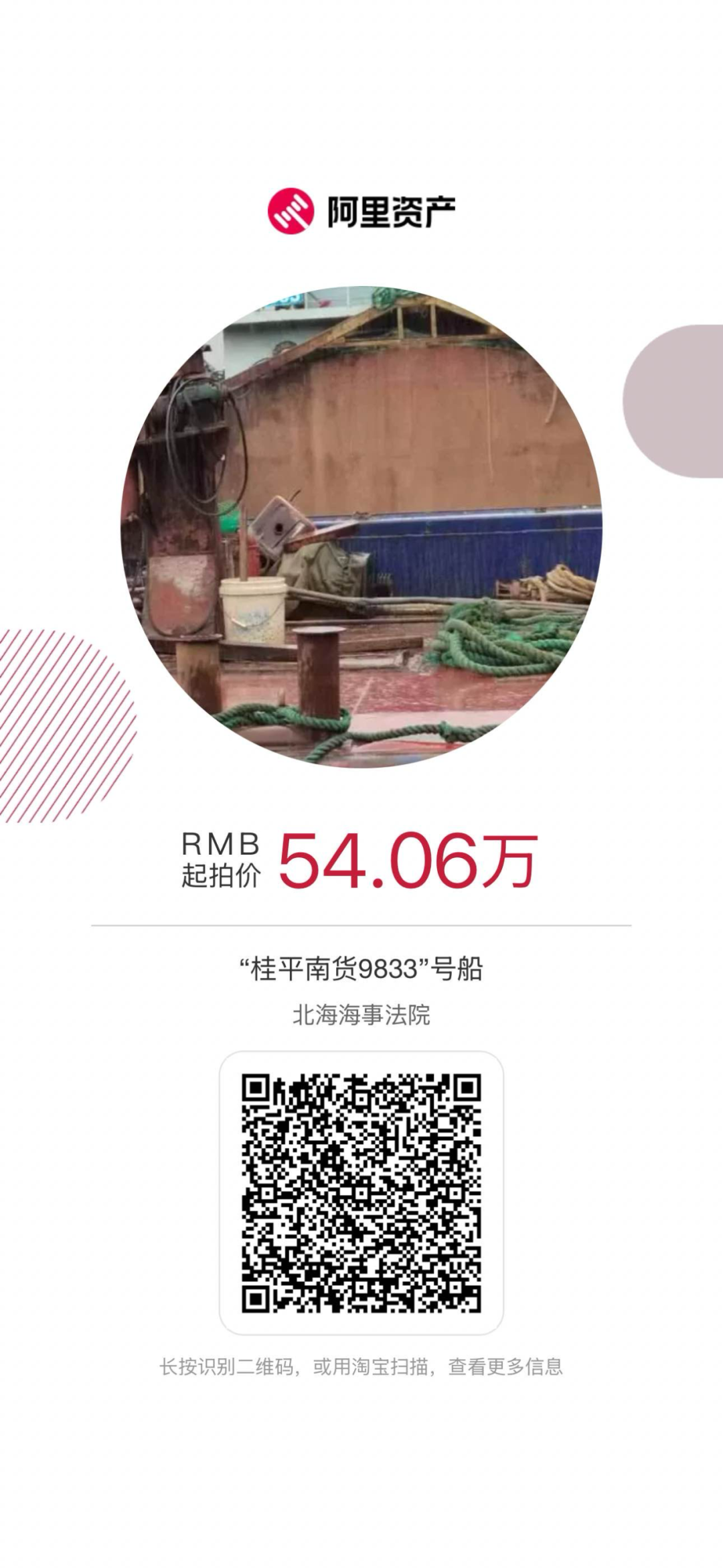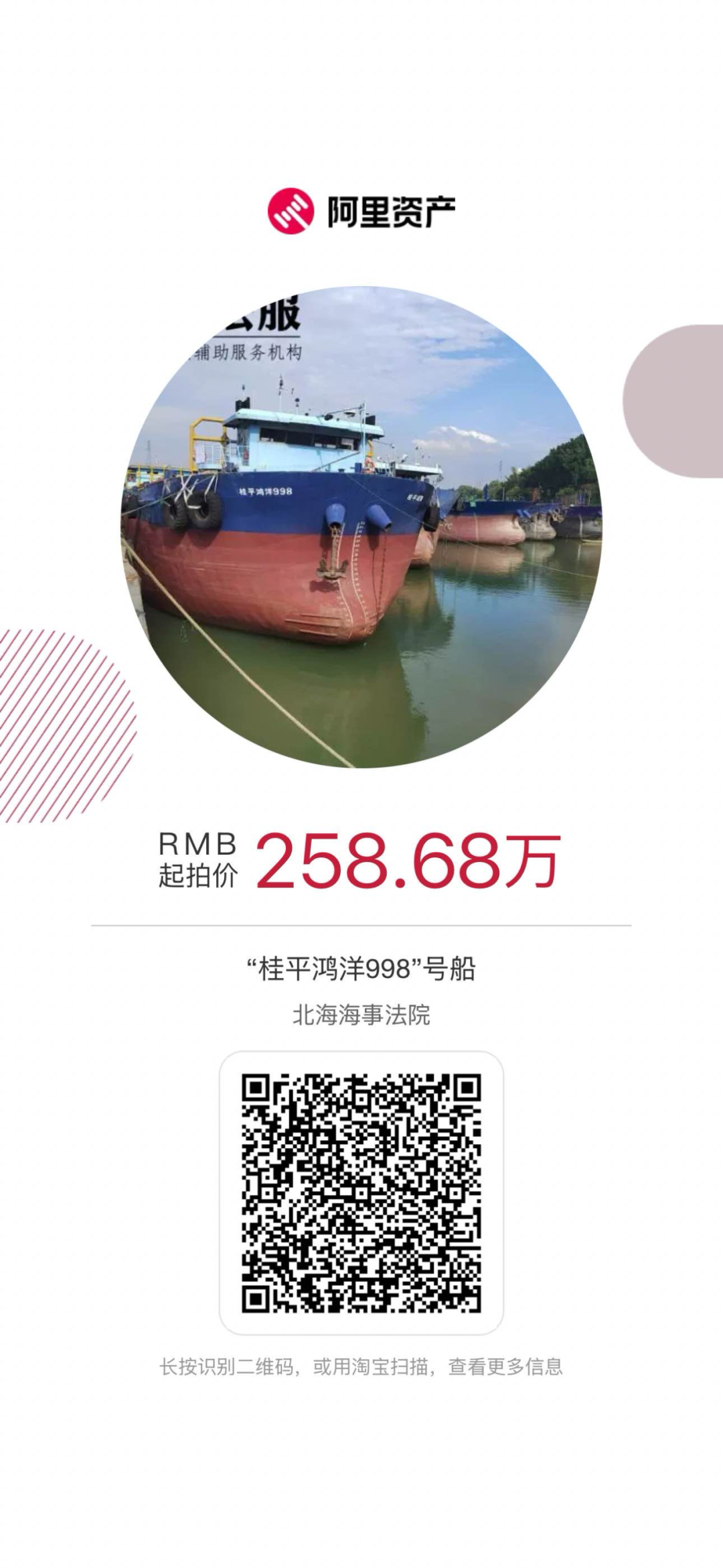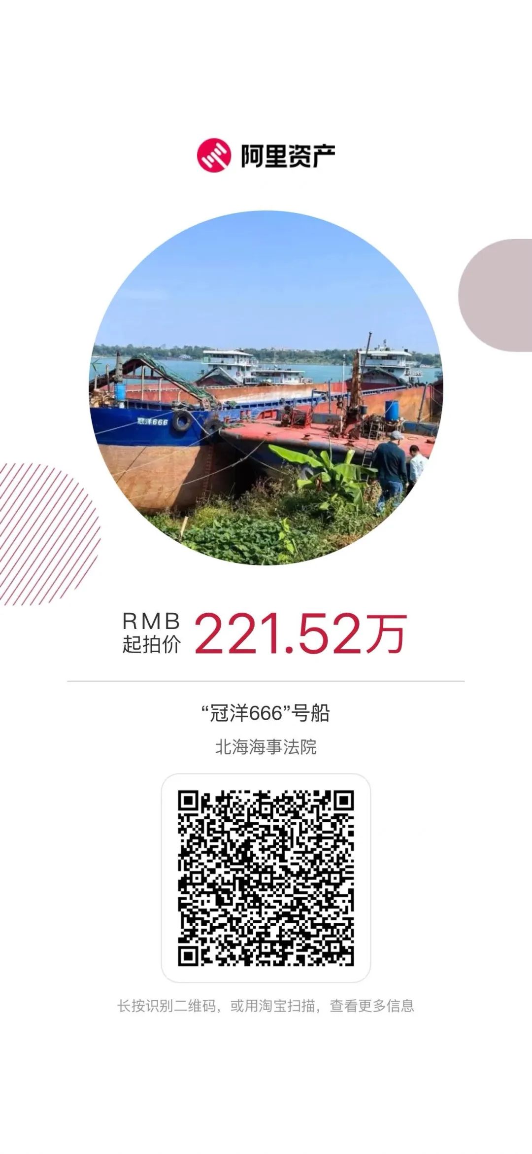 我行近期有部分优质营运船舶抵押物于淘宝司法拍卖网进行公开拍卖活动,现公告如下(详情可长按识别下方图片二维码查看):