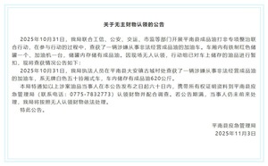 平南县应急管理局于2025年11月3日发布公告,通报在10月31日开展的成品油打非专项整治联合行动中,于大安镇古城村查获一辆无牌白色五十铃厢式改装加油车,车内装有储油罐、加油机及620公斤成品油。因现场无人认领,执法部门已暂扣油品,现公告要求当事人在60日内携带所有权证明前往认领并配合调查,逾期将依法按无主财物处理。此次行动展现了多部门联合打击非法经营成品油行为的执法力度,有效消除了重大安全隐患